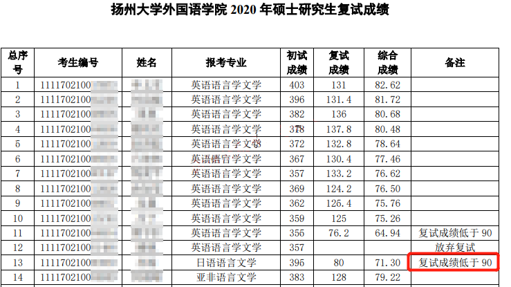 比如去年扬州大学日语语言文学专业唯一的过线考生复试被刷了,原因是没有达到复试及格线(扬州大学外国语学院复试成绩总分150,及格线90),与目标院校遗憾失之交臂。