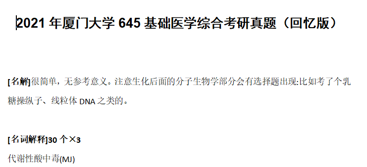 完整版请下载附件:2021年厦门大学645基础医学综合考研真题(回忆版)