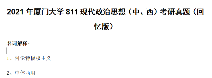 完整版请下载附件:2021年厦门大学811现代政治思想(中、西)考研真题(回忆版)