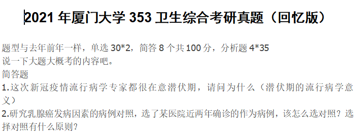 完整版请下载附件:2021年厦门大学353卫生综合考研真题(回忆版)