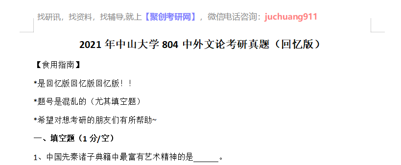 以上是聚创考研网为考生整理的"2021年中山大学804中外文论考研真题(回忆版)"的相关考研信息,希望对大家考研备考有所帮助! 备考过程中如有疑问,也可以添加老师微信juchuang911进行咨询。