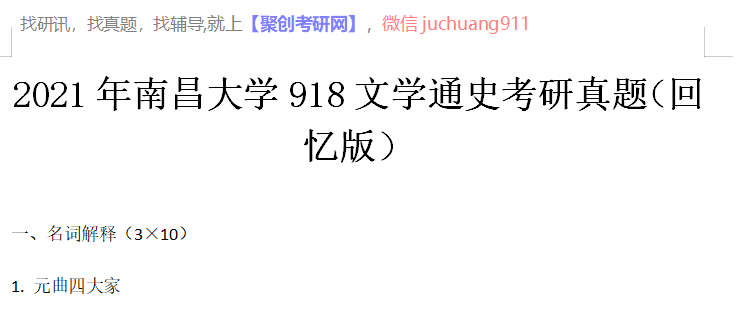 以上是聚创考研网为考生整理的"2021年南昌大学918文学通史考研真题(回忆版)"的相关考研信息,希望对大家考研备考有所帮助! 备考过程中如有疑问,也可以添加老师微信juchuang911进行咨询。