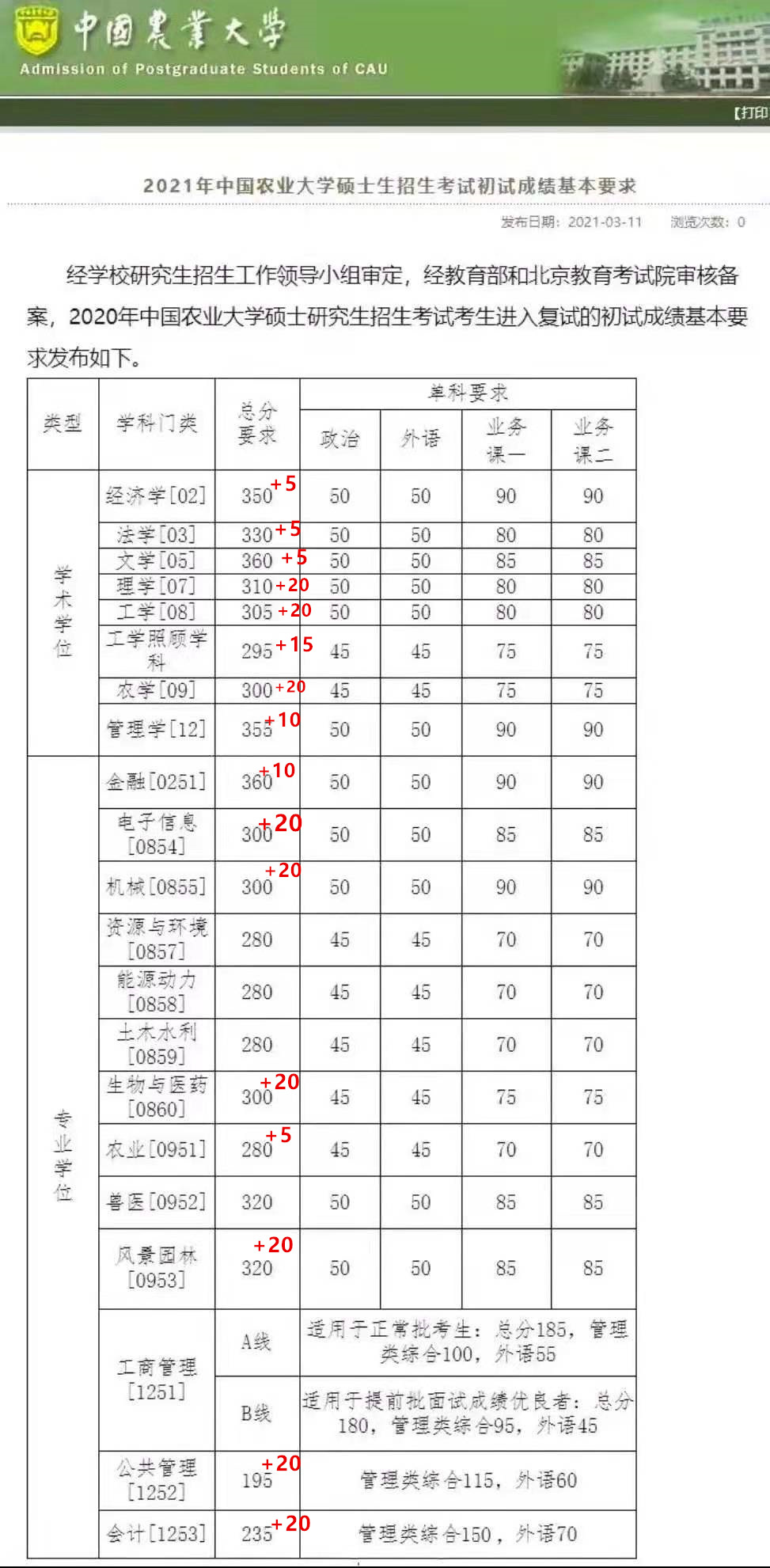 或是因公告中正文年份编辑错误??学校把公告删除了。下图为微博传图,聚创考研网和2020年的复试线对比之后,涨降情况如下:(注意:下图仅供参考,最终以中国农业大学官方网站发布为准!!)