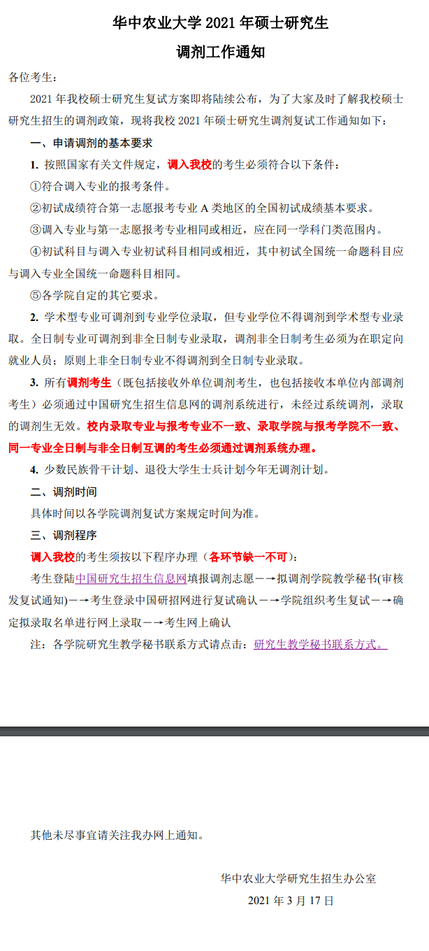 以上是聚创考研网为考生整理的"华中农业大学2021年研究生招生复试调剂公告"的相关考研信息,希望对大家考研备考有所帮助! 备考过程中如有疑问,也可以添加老师微信juchuang911进行咨询。