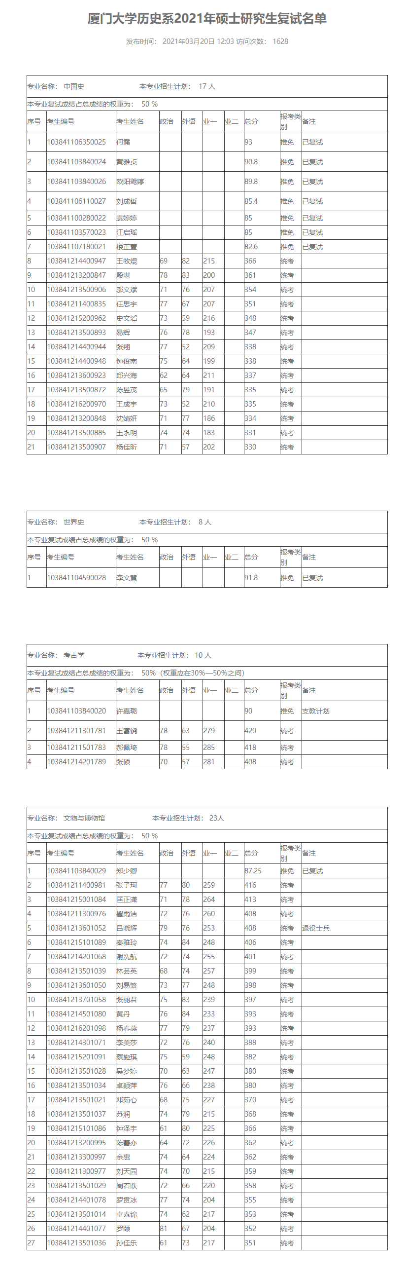 以上是聚创考研网为考生整理的"厦门大学历史系2021年硕士研究生复试名单"的相关考研信息,希望对大家考研备考有所帮助! 备考过程中如有疑问,也可以添加老师微信juchuang911进行咨询。