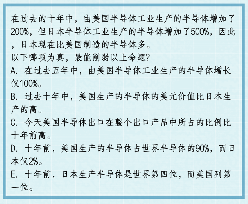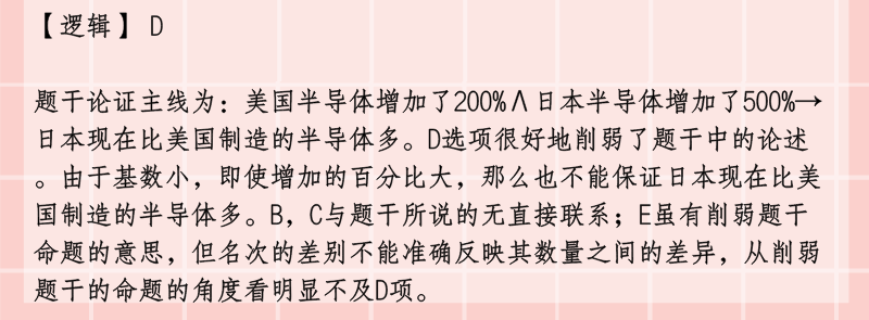 以上是聚创考研网为考生整理的"2022年管理类考研:逻辑部分-削弱命题关于半导体论述的选项Part.57"的相关考研信息,希望对大家考研备考有所帮助! 备考过程中如有疑问,也可以添加老师微信juchuang911进行咨询。