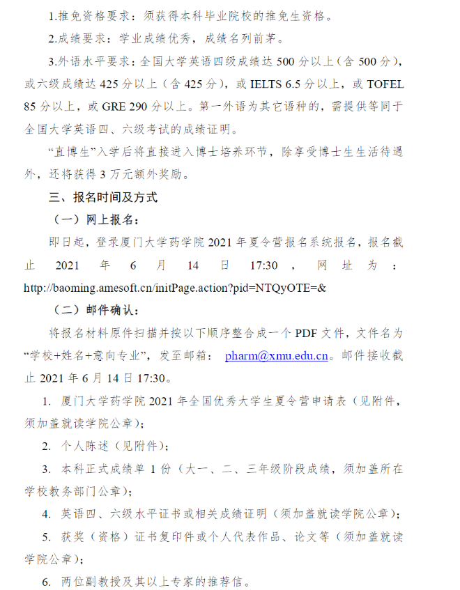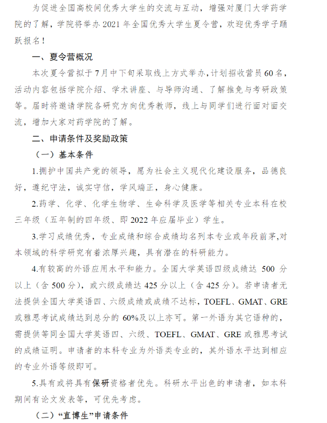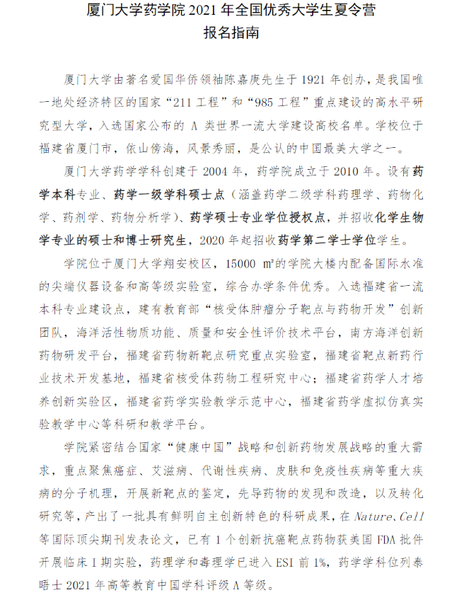 据悉,厦门大学药学院2021年夏令营报名指南更新,聚创考研网整理了部分内容展示如下: