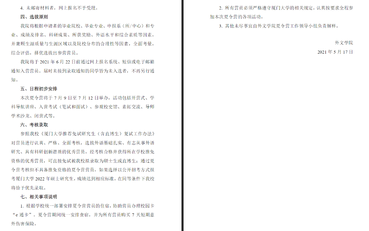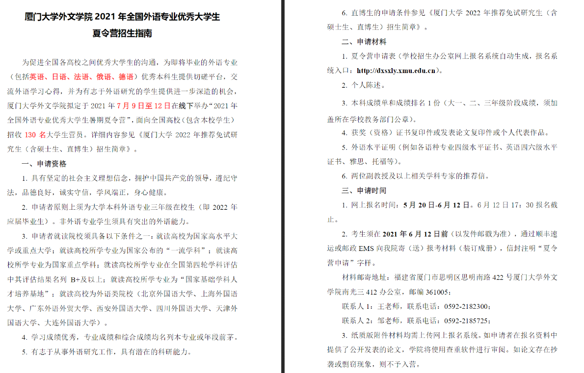 据悉,厦门大学外文学院2021年全国外语专业优秀大学生夏令营招生指南更新,聚创考研网整理了部分内容展示如下: