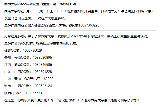 以上是聚创考研网为考生整理的"获取内部信息!厦大、西南大、哈工大等多所高校2022年研究生招生宣讲会开启!"的相关考研信息,希望对大家考研备考有所帮助! 备考过程中如有疑问,也可以添加老师微信juchuang911进行咨询。