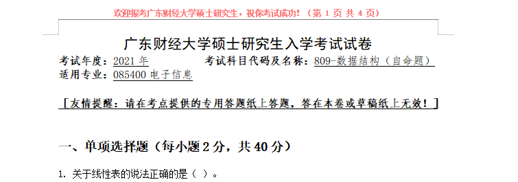 考研学习中,专业课占的分值较大。报考院校专业的考研专业课真题是专业课复习中必不可少的资料。聚创广东财经大学考研小编为大家整理了2021年广东财经大学809数据结构(自命题)考研真题 ,并且可以提供广东财经大学考研专业课辅导,希望更多考生能够在专业课上赢得高分,升入理想的院校。