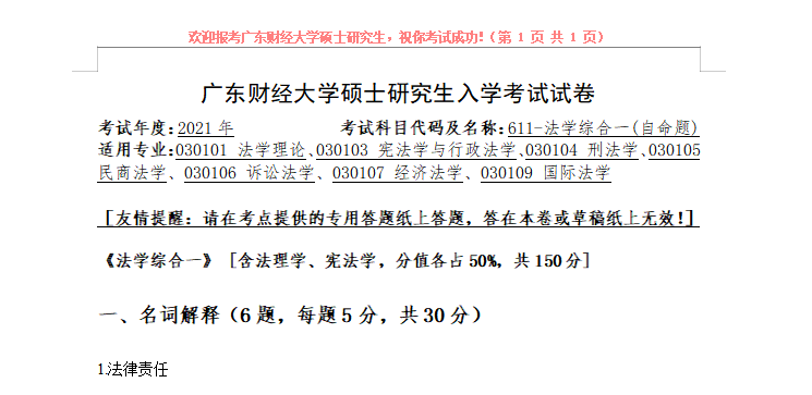 完整版请下载附件:2021年广东财经大学611法学综合一(自命题)考研真题