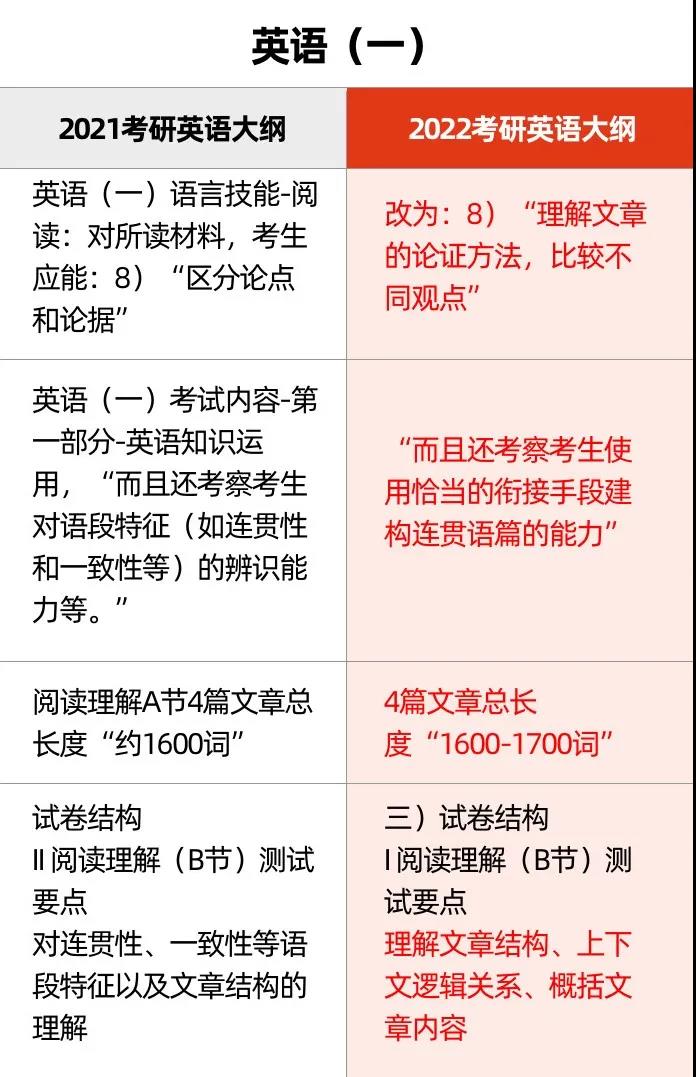 以上是聚创考研网为考生整理的"【英语大纲解析】2022年英语一考研大纲考点变动多吗?速戳!"的相关考研信息,希望对大家考研备考有所帮助! 备考过程中如有疑问,也可以添加老师微信juchuang911进行咨询。