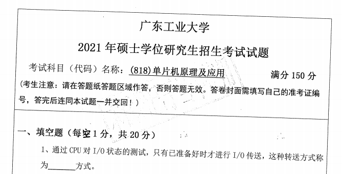 完整版请下载附件:2021年广东工业大学818单片机原理及应用考研真题(完整版)