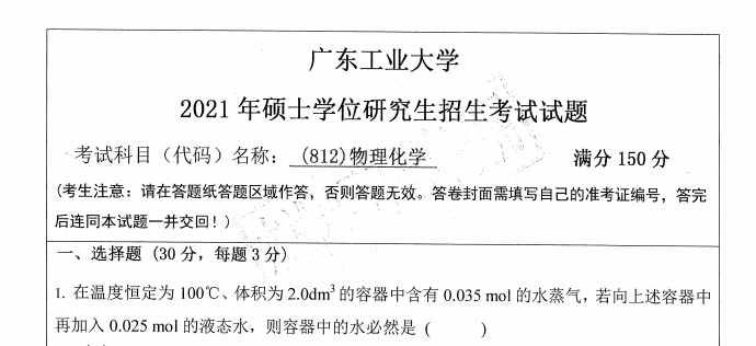 完整版请下载附件:2021年广东工业大学812物理化学考研真题(完整版)