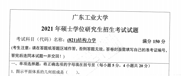 考研学习中,专业课占的分值较大。报考院校专业的考研专业课真题是专业课复习中必不可少的资料。聚创广东工业大学考研陈老师为大家整理了2021年广东工业大学821结构力学考研真题(完整版),并且可以提供广东工业大学考研专业课辅导,希望更多考生能够在专业课上赢得高分,升入理想的院校。
