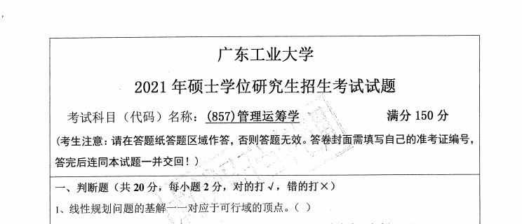 完整版请下载附件:2021年广东工业大学(857)管理运筹学考研真题(完整版)