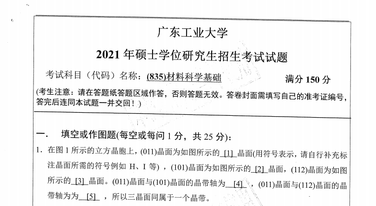 完整版请下载附件:2021年广东工业大学(835)材料科学基础考研真题(完整版)