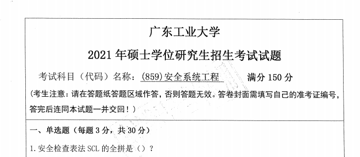 考研学习中,专业课占的分值较大。报考院校专业的考研专业课真题是专业课复习中必不可少的资料。聚创广东工业大学考研陈老师为大家整理了2021年广东工业大学(859)安全系统工程考研真题(完整版),并且可以提供广东工业大学考研专业课辅导,希望更多考生能够在专业课上赢得高分,升入理想的院校。