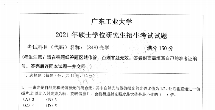 完整版请下载附件:2021年广东工业大学(848)光学考研真题(完整版)
