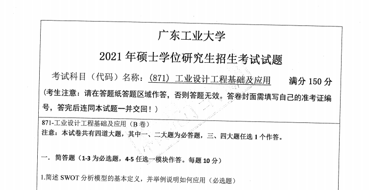 完整版请下载附件:2021年广东工业大学(871)工业设计工程基础及应用考研真题(完整版)