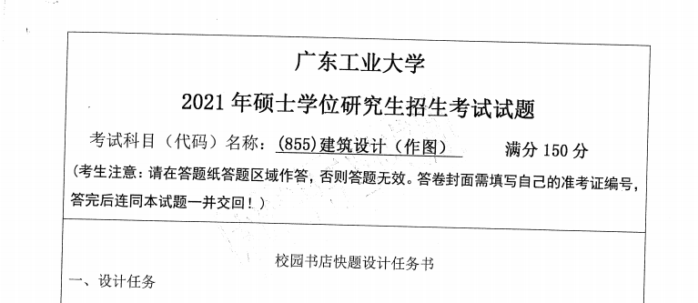 考研学习中,专业课占的分值较大。报考院校专业的考研专业课真题是专业课复习中必不可少的资料。聚创广东工业大学考研陈老师为大家整理了2021年广东工业大学(855)建筑设计(作图)考研真题(完整版),并且可以提供广东工业大学考研专业课辅导,希望更多考生能够在专业课上赢得高分,升入理想的院校。