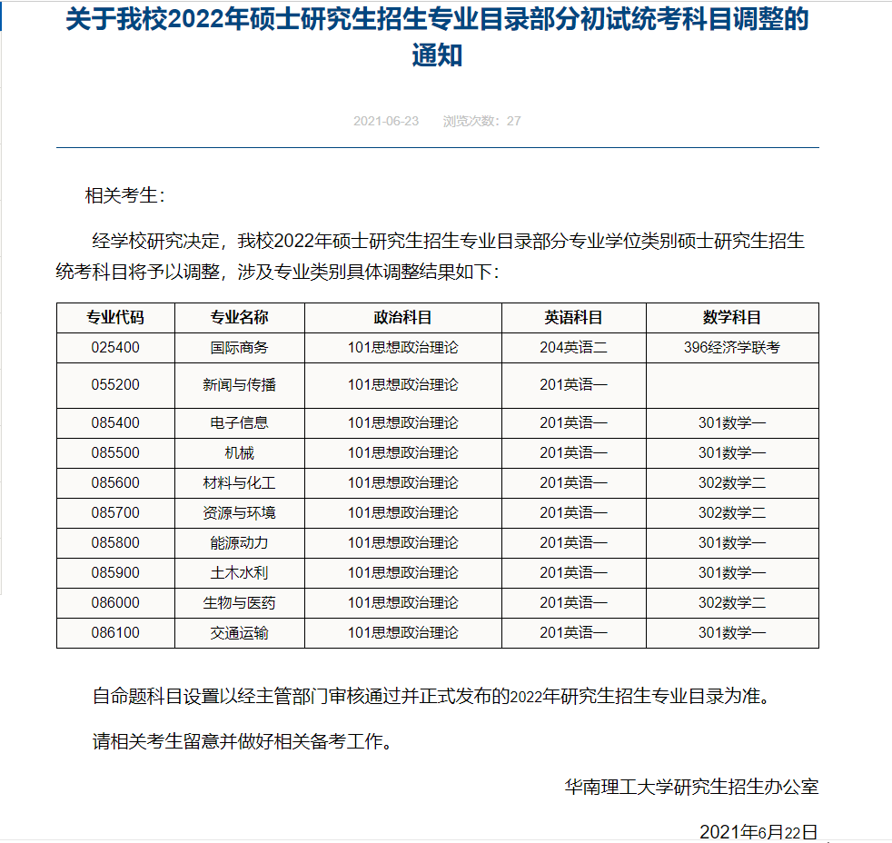 从华南理工大学发布的通知我们可以看到,今年很多专业都改考成了英语一和数学一,其中不乏像电子信息、机械、材料与化工等专硕,要知道专硕基本上都是考英二和数二的,这次的调整,可以说是大大提高了考试难度。