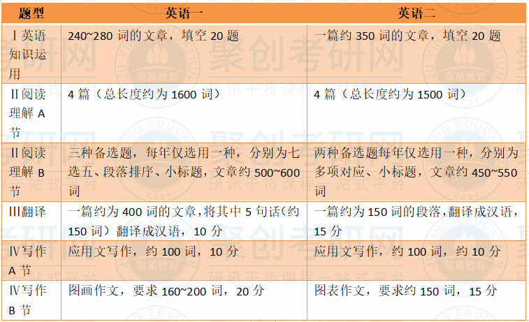 在比较之前,聚创考研网晚玉老师先整理了一下关于英语一和英语二的试卷结构对比,方便同学们更直观的比较出二者的不同。