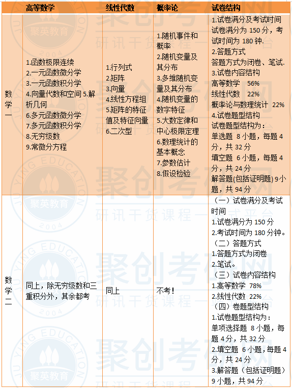 根据上表,同学们可以很直观的看到数学一和数学二的不同点,最大的区别就是数二不考概率论,而数一考概率论。