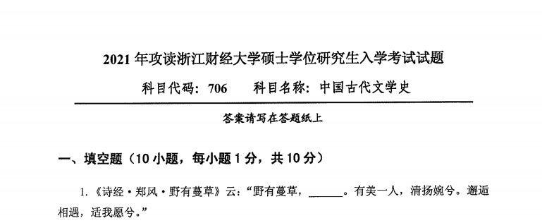 完整版请下载附件:2021年浙江财经大学706中国古代文学史考研真题(完整版)