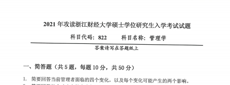 考研学习中,专业课占的分值较大。报考院校专业的考研专业课真题是专业课复习中必不可少的资料。聚创浙江财经大学考研陈老师为大家整理了2021年浙江财经大学822管理学考研真题(完整版),并且可以提供浙江财经大学考研专业课辅导,希望更多考生能够在专业课上赢得高分,升入理想的院校。