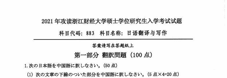 考研学习中,专业课占的分值较大。报考院校专业的考研专业课真题是专业课复习中必不可少的资料。聚创浙江财经大学考研陈老师为大家整理了2021年浙江财经大学883日语翻译与写作考研真题(完整版),并且可以提供浙江财经大学考研专业课辅导,希望更多考生能够在专业课上赢得高分,升入理想的院校。