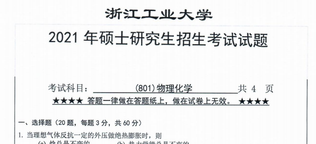 考研学习中,专业课占的分值较大。报考院校专业的考研专业课真题是专业课复习中必不可少的资料。聚创浙江工业大学考研网为大家整理了2021年浙江工业大学801物理化学考研真题(完整版),并且可以提供浙江工业大学考研专业课辅导,希望更多考生能够在专业课上赢得高分,升入理想的院校。