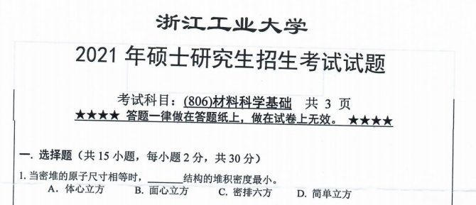 考研学习中,专业课占的分值较大。报考院校专业的考研专业课真题是专业课复习中必不可少的资料。聚创浙江工业大学考研网为大家整理了2021年浙江工业大学806材料科学基础考研真题(完整版),并且可以提供浙江工业大学考研专业课辅导,希望更多考生能够在专业课上赢得高分,升入理想的院校。