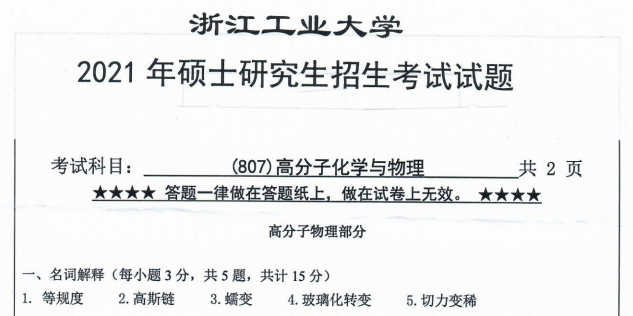 考研学习中,专业课占的分值较大。报考院校专业的考研专业课真题是专业课复习中必不可少的资料。聚创浙江工业大学考研网为大家整理了2021年浙江工业大学807高分子化学与物理考研真题(完整版),并且可以提供浙江工业大学考研专业课辅导,希望更多考生能够在专业课上赢得高分,升入理想的院校。