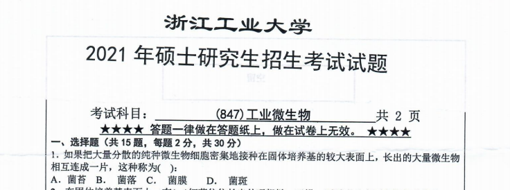 完整版请下载附件:2021年浙江工业大学847工业微生物考研真题(完整版)