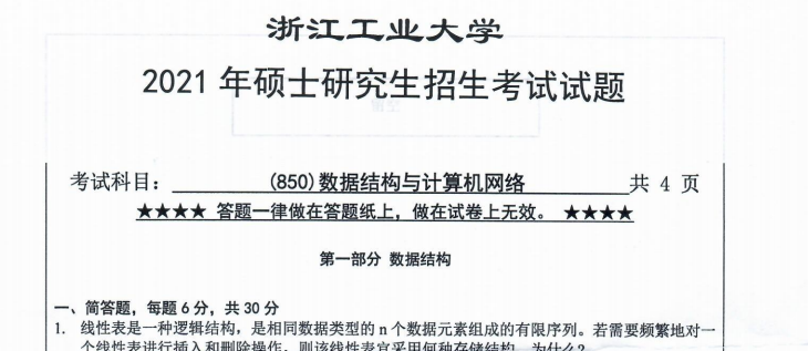 完整版请下载附件:2021年浙江工业大学850数据结构与计算机网络考研真题(完整版)