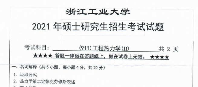 考研学习中,专业课占的分值较大。报考院校专业的考研专业课真题是专业课复习中必不可少的资料。聚创浙江工业大学考研网为大家整理了2021年浙江工业大学911工程热力学(II)考研真题(完整版),并且可以提供浙江工业大学考研专业课辅导,希望更多考生能够在专业课上赢得高分,升入理想的院校。