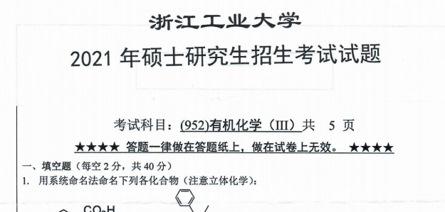 以上是聚创考研网为考生整理的"2021年浙江工业大学952有机化学(III)考研真题(完整版)"的相关考研信息,希望对大家考研备考有所帮助! 备考过程中如有疑问,也可以添加老师微信juchuang911进行咨询。