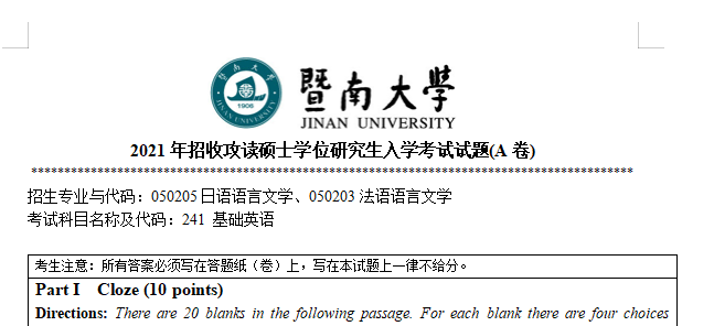 以上是聚创考研网为考生整理的"2021年暨南大学241 基础英语考研真题(完整版)"的相关考研信息,希望对大家考研备考有所帮助! 备考过程中如有疑问,也可以添加老师微信juchuang911进行咨询。