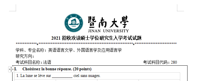 考研学习中,专业课占的分值较大。报考院校专业的考研专业课真题是专业课复习中必不可少的资料。聚创暨南大学考研网为大家整理了2021年暨南大学280法语考研真题(完整版),并且可以提供暨南大学考研专业课辅导,希望更多考生能够在专业课上赢得高分,升入理想的院校。