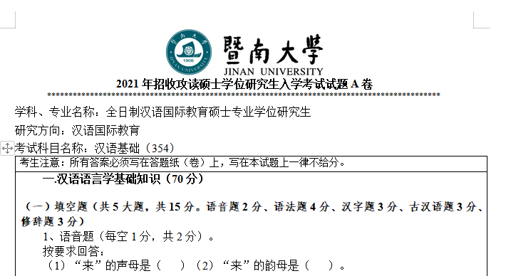考研学习中,专业课占的分值较大。报考院校专业的考研专业课真题是专业课复习中必不可少的资料。聚创暨南大学考研网为大家整理了2021年暨南大学354汉语基础考研真题(完整版),并且可以提供暨南大学考研专业课辅导,希望更多考生能够在专业课上赢得高分,升入理想的院校。