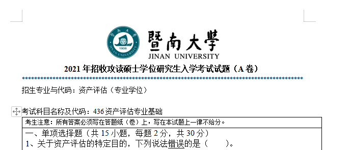 以上是聚创考研网为考生整理的"2021年暨南大学436资产评估专业基础考研真题(完整版)"的相关考研信息,希望对大家考研备考有所帮助! 备考过程中如有疑问,也可以添加老师微信juchuang911进行咨询。