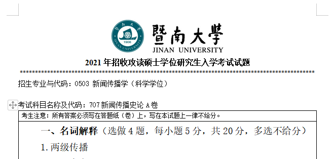 考研学习中,专业课占的分值较大。报考院校专业的考研专业课真题是专业课复习中必不可少的资料。聚创暨南大学考研网为大家整理了2021年暨南大学707新闻传播史论考研真题(完整版),并且可以提供暨南大学考研专业课辅导。