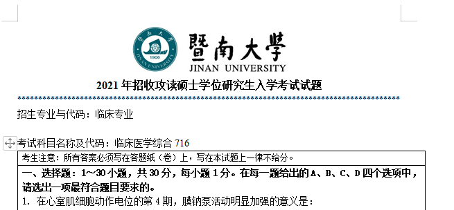 考研学习中,专业课占的分值较大。报考院校专业的考研专业课真题是专业课复习中必不可少的资料。聚创暨南大学考研网为大家整理了2021年暨南大学716临床医学综合考研真题(完整版),并且可以提供暨南大学考研专业课辅导。