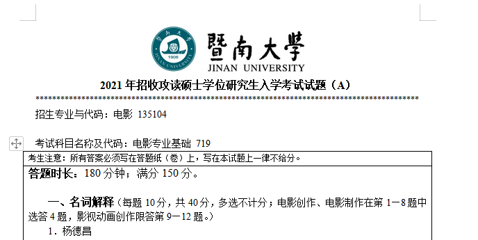 以上是聚创考研网为考生整理的"2021年暨南大学719电影专业基础考研真题(完整版)"的相关考研信息,希望对大家考研备考有所帮助! 备考过程中如有疑问,也可以添加老师微信juchuang911进行咨询。
