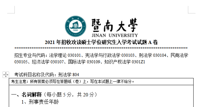 以上是聚创考研网为考生整理的"2021年暨南大学804刑法学考研真题(完整版)"的相关考研信息,希望对大家考研备考有所帮助! 备考过程中如有疑问,也可以添加老师微信juchuang911进行咨询。