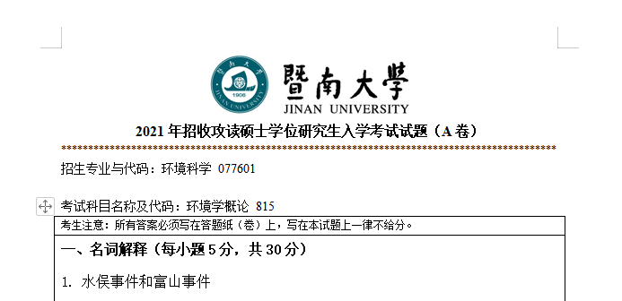 考研学习中,专业课占的分值较大。报考院校专业的考研专业课真题是专业课复习中必不可少的资料。聚创暨南大学考研网为大家整理了2021年暨南大学815环境学概论考研真题(完整版),并且可以提供暨南大学考研专业课辅导。