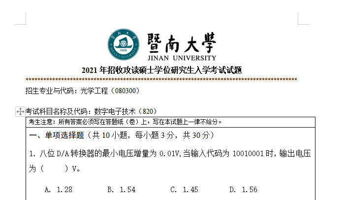以上是聚创考研网为考生整理的"2021年暨南大学820数字电子技术考研真题(完整版)"的相关考研信息,希望对大家考研备考有所帮助! 备考过程中如有疑问,也可以添加老师微信juchuang911进行咨询。