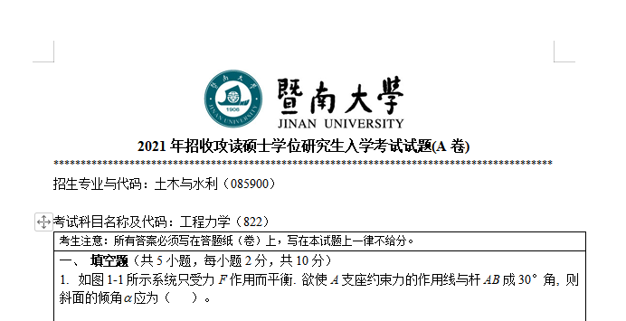 考研学习中,专业课占的分值较大。报考院校专业的考研专业课真题是专业课复习中必不可少的资料。聚创暨南大学考研网为大家整理了2021年暨南大学822工程力学考研真题(完整版),并且可以提供暨南大学考研专业课辅导。