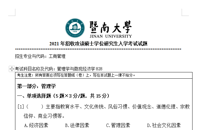 以上是聚创考研网为考生整理的"2021年暨南大学828管理学与微观经济学考研真题(完整版)"的相关考研信息,希望对大家考研备考有所帮助! 备考过程中如有疑问,也可以添加老师微信juchuang911进行咨询。